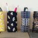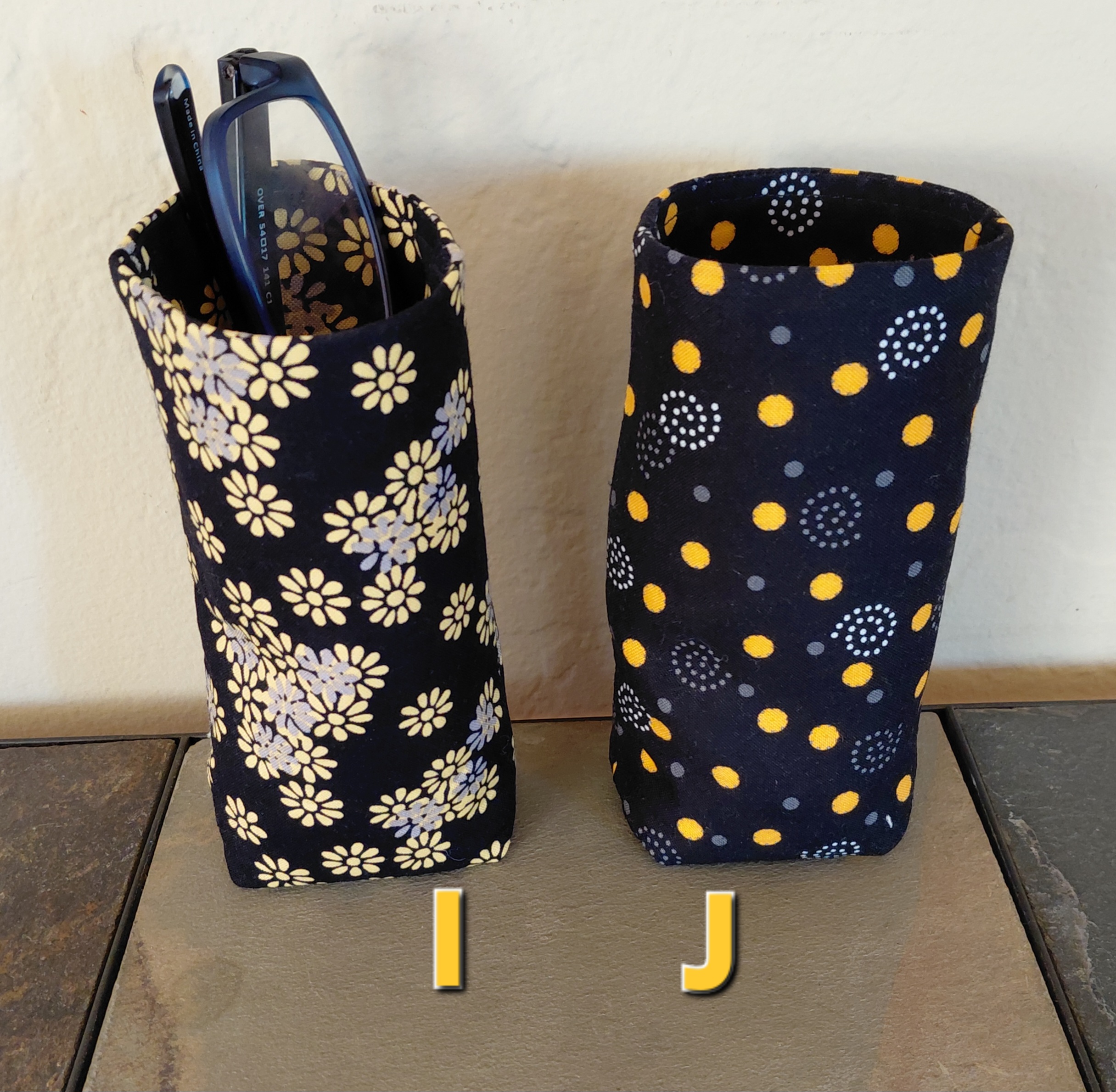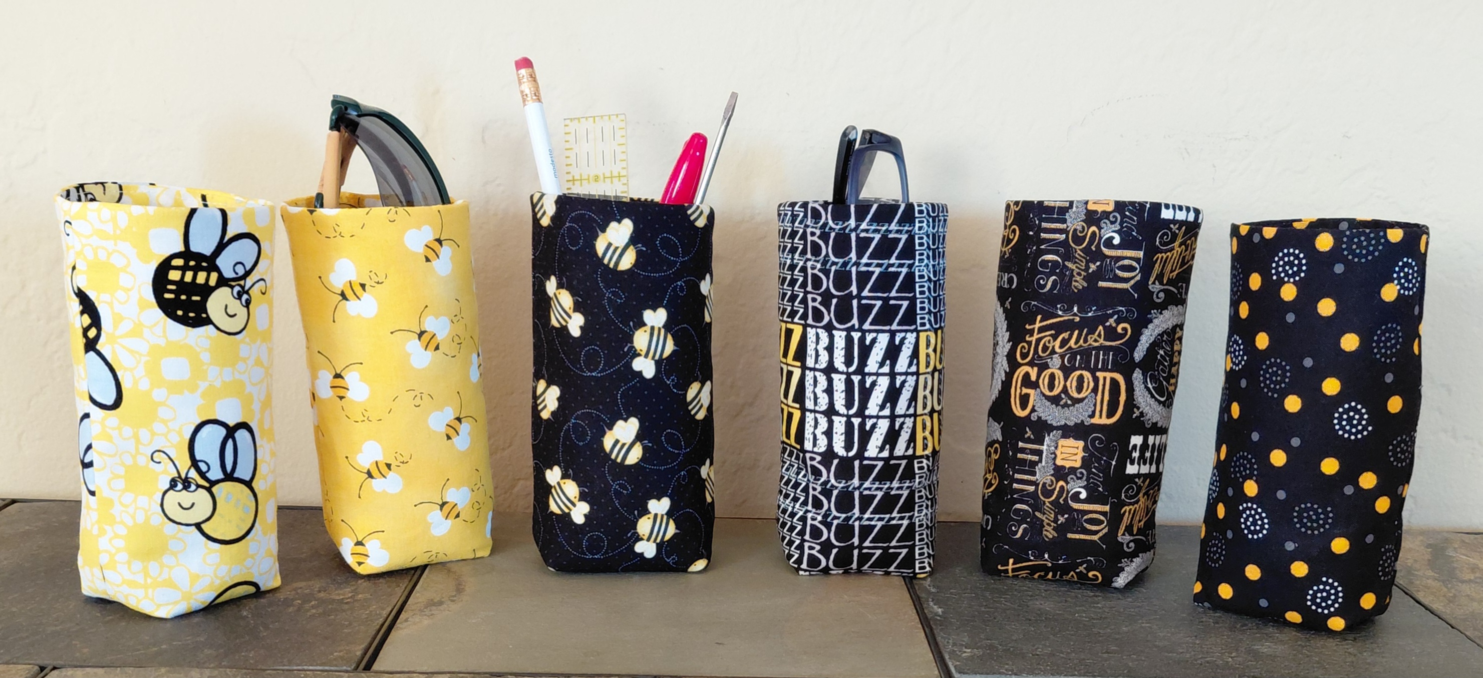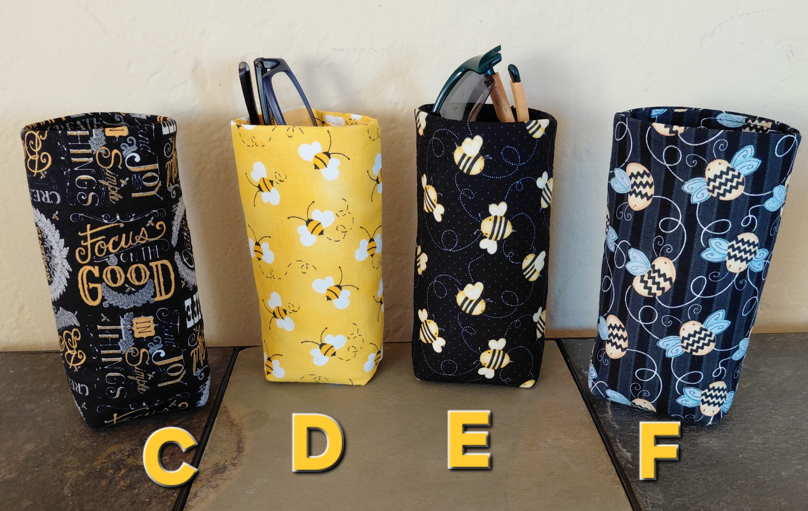 Keep your eyeglasses nearby and protected with an upright glasses pouch in a bees print or complementary black and yellow print. Simply slip your glasses in and out! The compact design takes up little space, and the weighted bottom keeps it upright. Reduce clutter on your end table, desk, workbench, counter, nightstand, etc. Use in the office, kitchen, craft room, living room, bedroom, patio, car, RV, at home or at work!