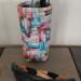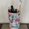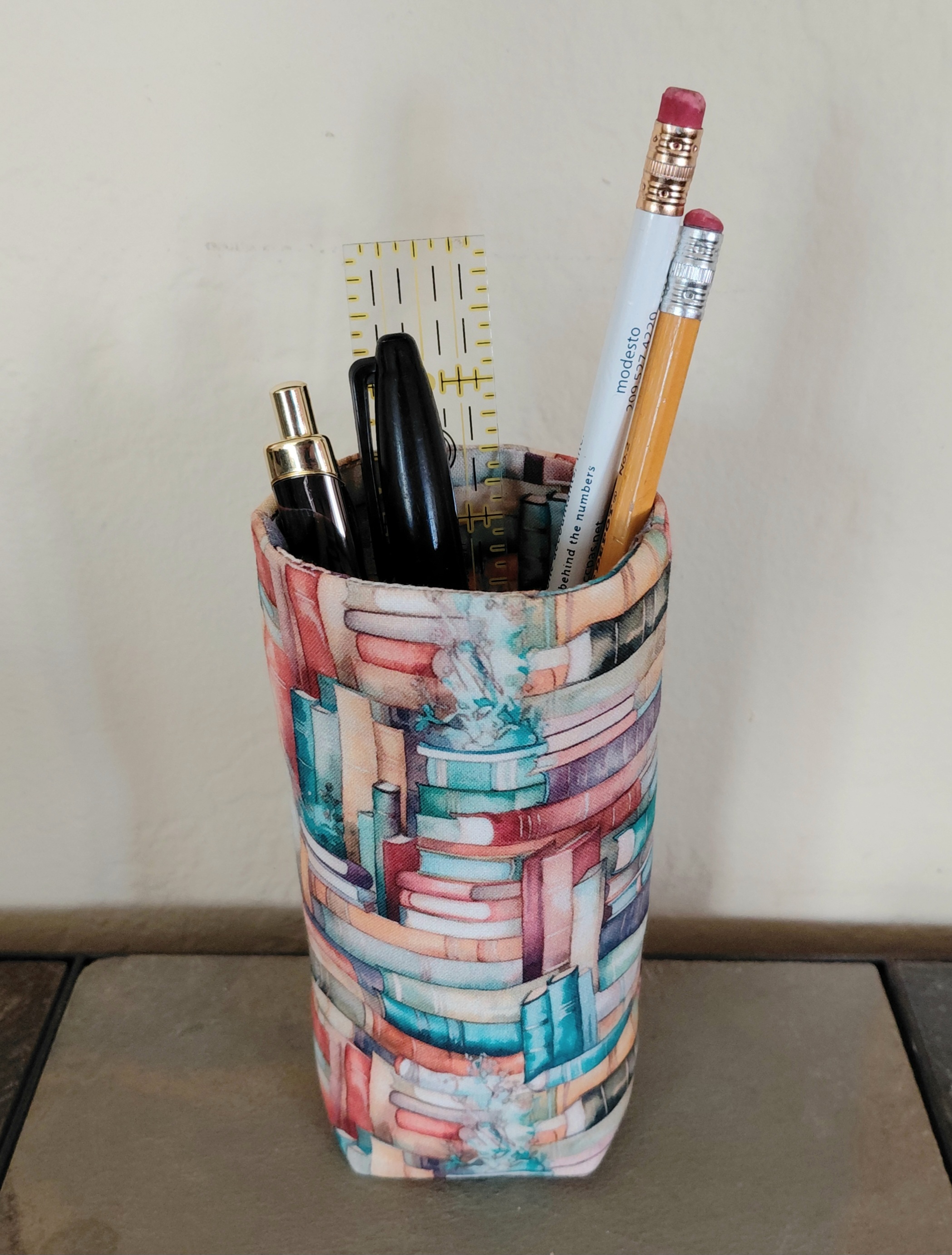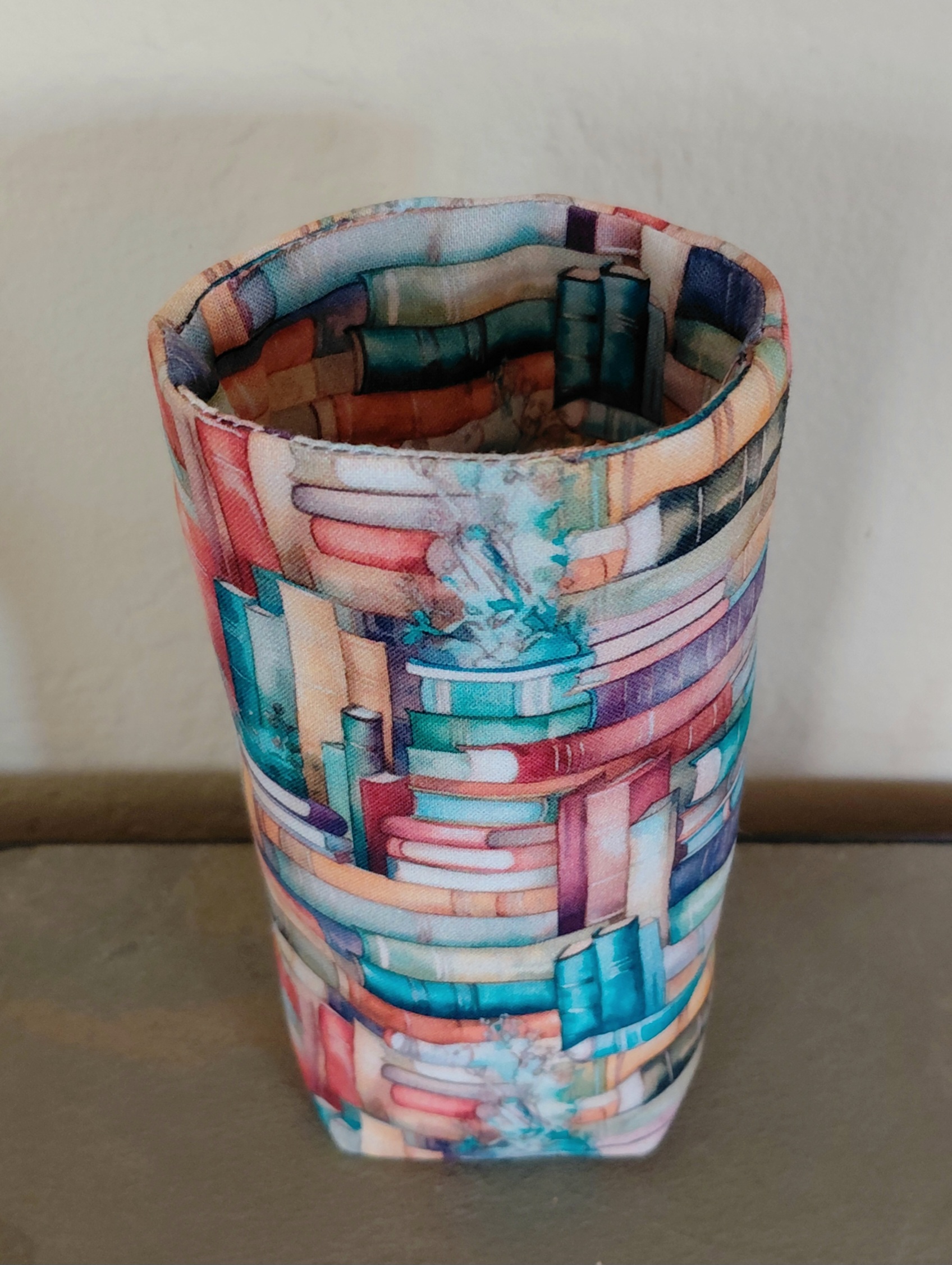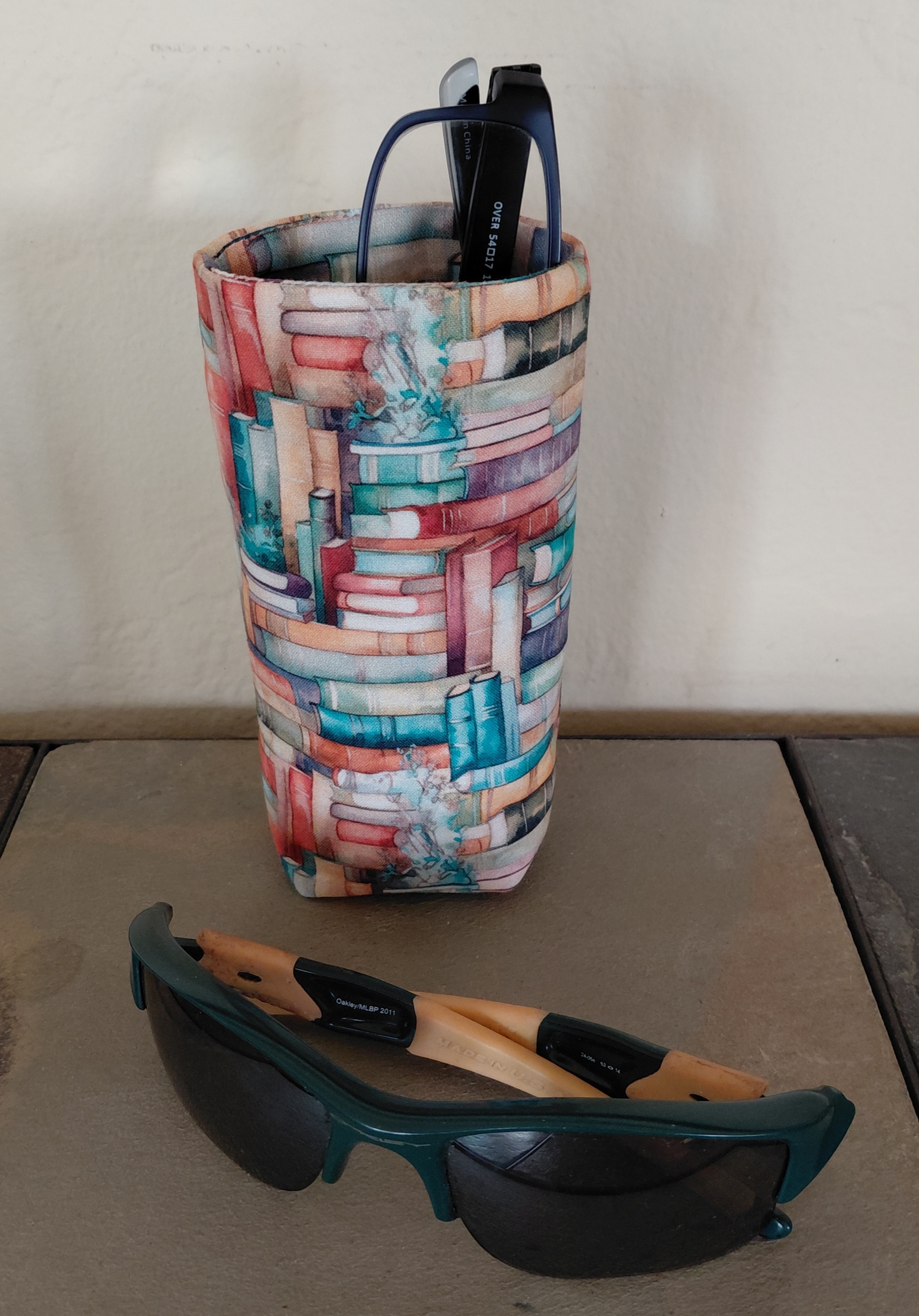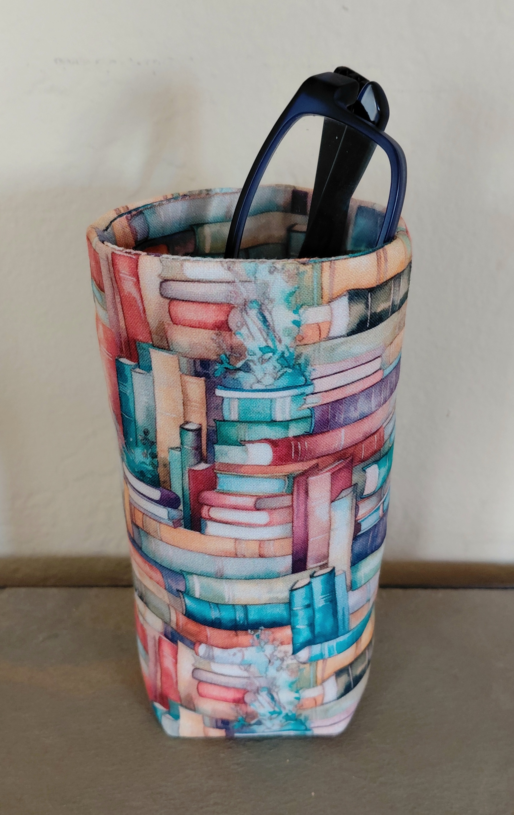 Eyeglasses holder with a whimsical watercolor style books print makes a thoughtful gift for people who love to read. Print features aqua color plants "growing" out of the covers of some of the books. Keeps reading glasses handy at bedside or on the end table. Simply slip glasses in and out! The compact design takes up minimal space, and the weighted bottom keeps it upright.