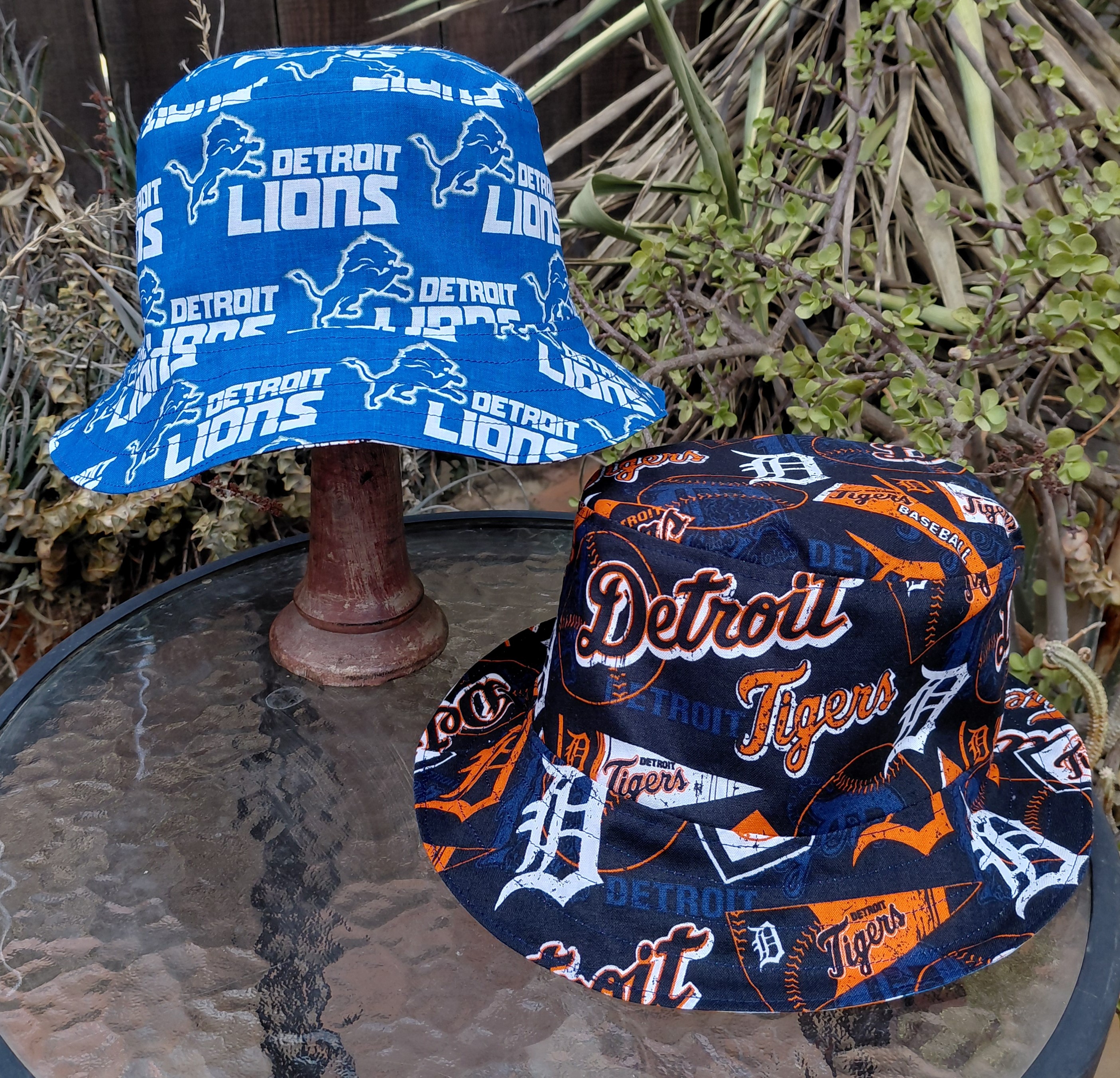 A Detroit team bucket hat that reverses from a blue and white Lions logo fabric, to a navy blue and orange Detroit Tigers logo fabric. Great gift for Michigan sports fans! Handmade from licensed fabrics. Not affiliated with the teams, NFL or MLB in any way.