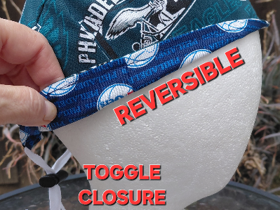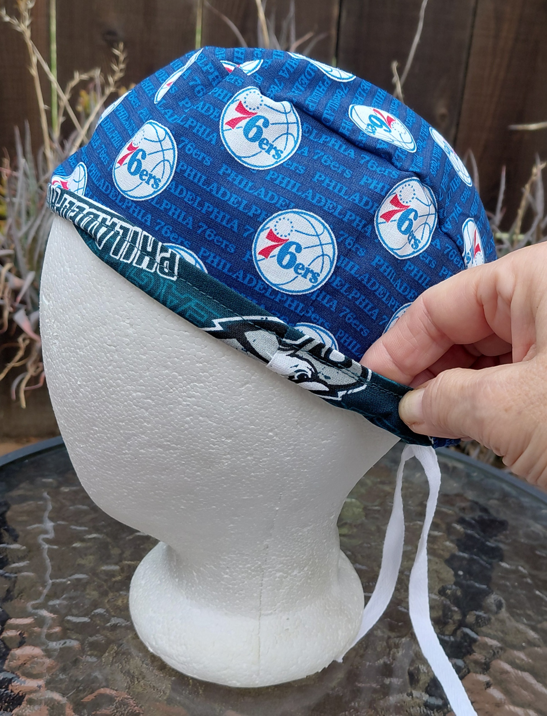 Two teams in one cap! Reversible Philadelphia 76ers and Eagles licensed prints. Toggle (cord lock) closure. Handmade from high quality woven cotton fabrics. Not affiliated with the teams or leagues.